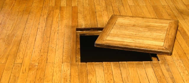 Close-up van de linkerhoek van het podium. De bluskast gaat open en de handgreep van de powerbox gaat op en neer! Ladder is op maat gemaakt.